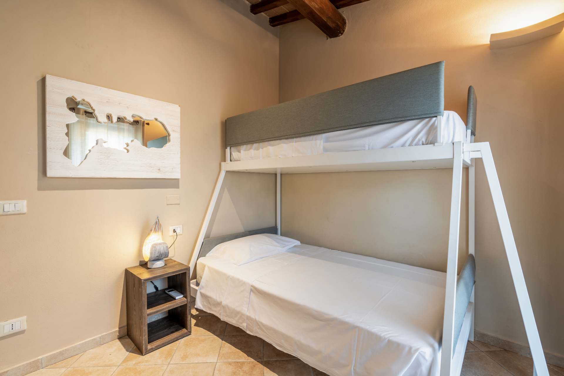 Ansonica, questa spaziosa casa che prende il nome da un vitigno caratteristico dell’isola d’Elba, si trova in una comoda posizione pianeggiante a circa 100 m dal mare, ed è quindi particolarmente indicato per chi viaggia con i bimbi al seguito. La zona di verde ombreggiata da cipressi e pini prospiciente la dimora è uno spazio che sembra fatto apposta per i giochi scatenati dei nostri più piccoli ospiti. Anche la vicinanza alla spiaggia è particolarmente apprezzata dalle famiglie e da tutti coloro che desiderano avere il mare a portata di mano. Ansonica è composto da salottino con angolo cottura, camera matrimoniale, camera con letto a castello (una piazza e mezza e singolo) + letto estraibile, un bagno. Può ospitare fino a 6 persone.
