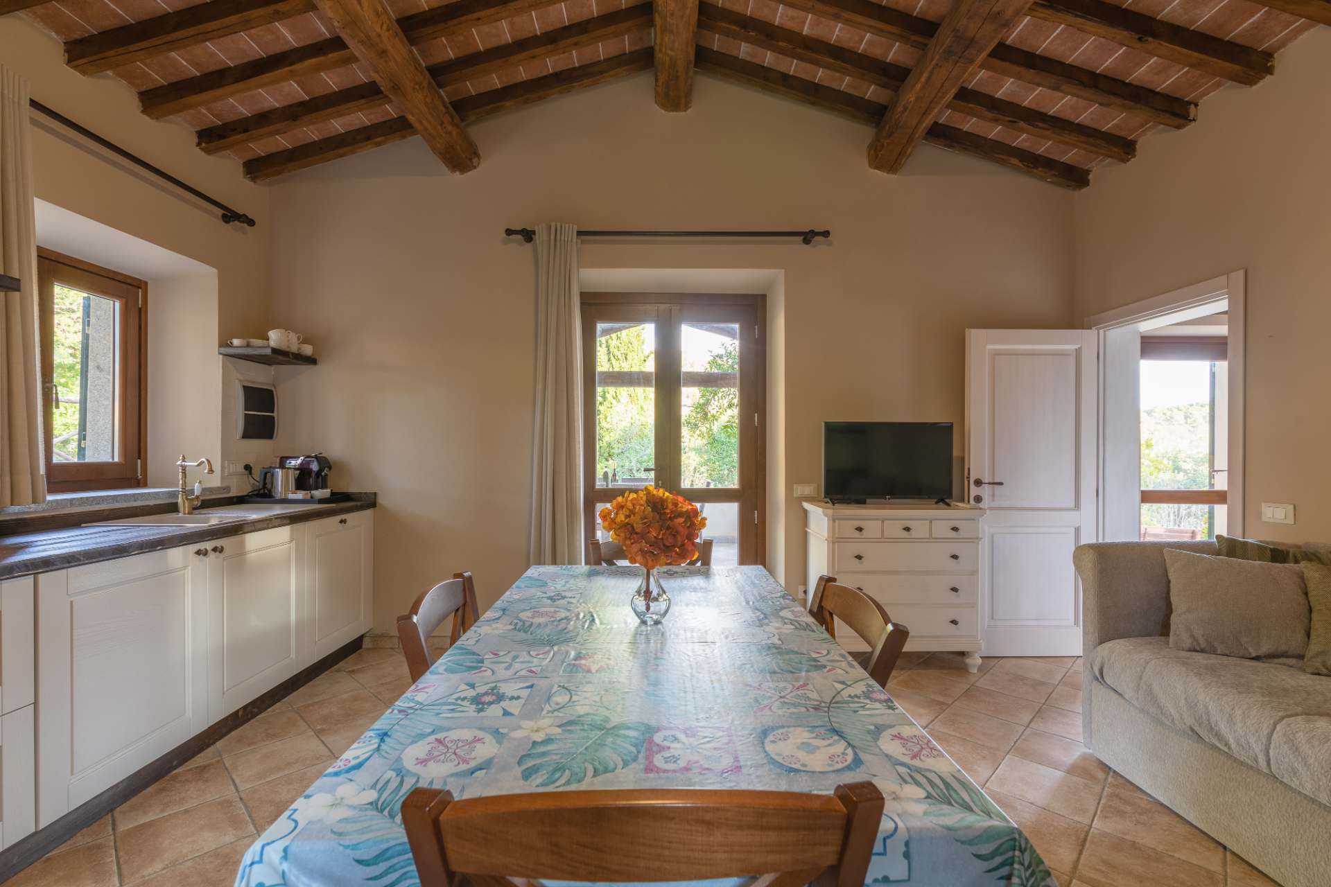 Una ridente casa di campagna, circondata dagli alberi e dalla macchia mediterranea, profumata di sole e piena di luce. È la Limonaia, un grande bilocale che si trova a soli 100 metri di distanza dal mare. Arredata con grazia e attenzione per i particolari, questa casa è composta da salottino con angolo cottura e divano letto matrimoniale, camera matrimoniale e bagno. Come tutti gli altri alloggi dell’agriturismo ha uno spazio esterno attrezzato con zona pranzo per offrire a chi lo abita un contatto pieno e costante con la magnifica natura che ci circonda. Limonaia può ospitare fino a 4 persone.